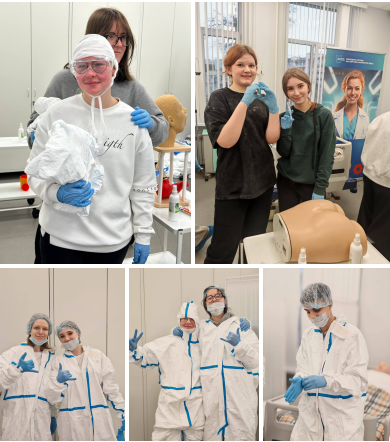 Знакомство школьников с профессией медицинской сестры началось с наблюдения за выполнением практических навыков. Преподаватели продемонстрировали в симулированных условиях следующие манипуляции: «Надевание средств индивидуальной защиты при особо опасных инфекциях», «Наложение повязки «Чепец», «Внутримышечное введение лекарственных средств».